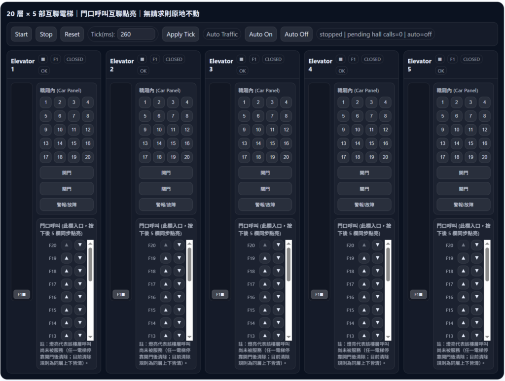首頁/案例總覽/全部案例/電梯群控調度平台(多情境模擬 / 策略驗證) 電梯群控調度平台(多情境模擬 / 策略驗證)Owen Chiang2026 年 1 月 11 日全部案例, 智慧維運, 案例總覽 系統摘要 (System Overview) 本系統設計目的是一個針對多台電梯群控派梯(Multi-Car Group Control)的互動式模擬與策略驗證平台。透過參數化配置樓層呼叫、轎廂目的地按鍵及多元交通情境(如尖離峰、瞬間大流量),系統能以2D 視覺化方式即時呈現派梯決策過程與運行狀態。其設計核心在於提供一個低成本的數位實驗環境,讓開發與維運團隊能在實際部署前,針對調度策略進行壓力測試與可行性驗證,將複雜的演算邏輯轉化為直觀、可解釋的數據依據。 核心功能 (Core Features) 多台群控:多車廂、多樓層同時服務的派梯模擬,支援不同派梯規則切換與比較。 樓層呼叫/轎廂按鍵:同時涵蓋樓層呼叫與車廂目的地輸入,貼近真實使用行為。 交通情境:以流量/到達率驅動的乘客產生與排隊模型,用於壓力測試與邊界條件驗證。 即時狀態視覺化:車廂位置、方向、停靠序列與派梯結果一目了然,便於對策略行為做可解釋分析。 產業應用 (Industry Applications) 智慧建築/大型場域規劃:商辦、醫院、飯店、百貨、交通樞紐等多電梯場域的服務能力評估。策略驗證與風險預演:新派梯規則導入前,預先檢視尖峰擁擠、長等待與特定樓層壅塞風險。 數位孿生/營運優化 PoC:作為後續整合 IoT 事件、載客量估測、或能源/舒適度指標的驗證基座。教育訓練與展示:用可重現場景快速展示派梯策略差異,便於跨部門溝通(維運/物業/業主)。 進入系統測試